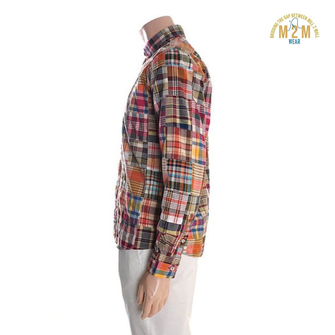 Plain weave base; constructed by stitching pre-printed cotton fabric patches in grid or panel layouts. May feature either visible topstitching or seamless joining depending on style.