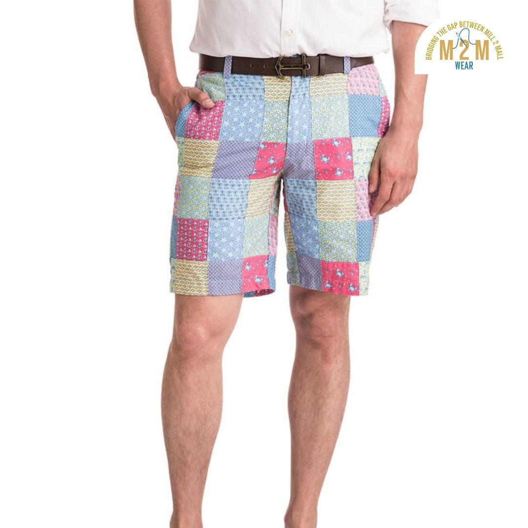 Plain weave base; constructed by stitching pre-printed cotton fabric patches in grid or panel layouts. May feature either visible topstitching or seamless joining depending on style.