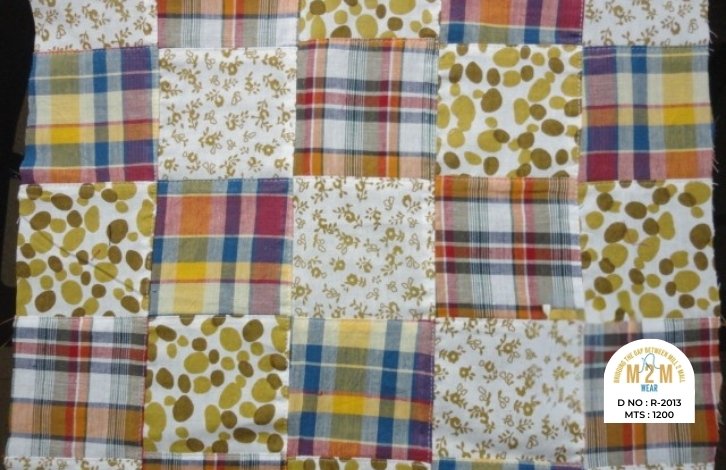 Plain weave base; constructed by stitching pre-printed cotton fabric patches in grid or panel layouts. May feature either visible topstitching or seamless joining depending on style.