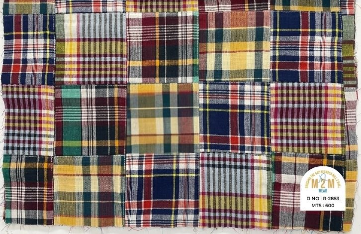 Plain weave base; constructed by stitching pre-printed cotton fabric patches in grid or panel layouts. May feature either visible topstitching or seamless joining depending on style.