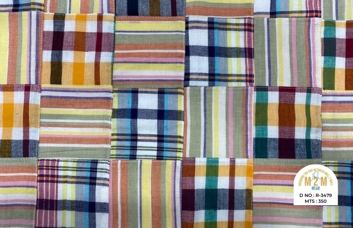 Plain weave base; constructed by stitching pre-printed cotton fabric patches in grid or panel layouts. May feature either visible topstitching or seamless joining depending on style.