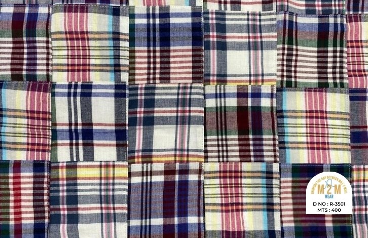 Plain weave base; constructed by stitching pre-printed cotton fabric patches in grid or panel layouts. May feature either visible topstitching or seamless joining depending on style.