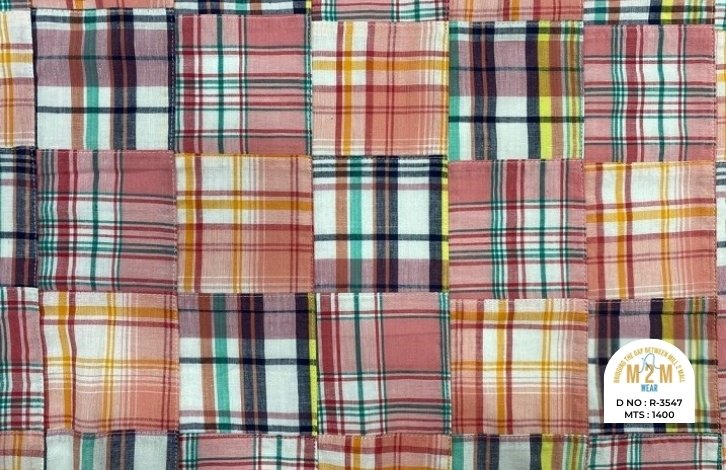 Plain weave base; constructed by stitching pre-printed cotton fabric patches in grid or panel layouts. May feature either visible topstitching or seamless joining depending on style.