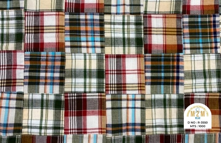 Plain weave base; constructed by stitching pre-printed cotton fabric patches in grid or panel layouts. May feature either visible topstitching or seamless joining depending on style.