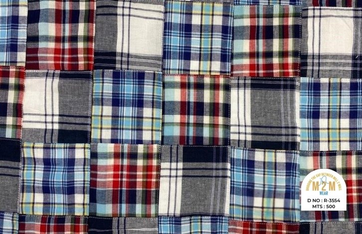 Plain weave base; constructed by stitching pre-printed cotton fabric patches in grid or panel layouts. May feature either visible topstitching or seamless joining depending on style.