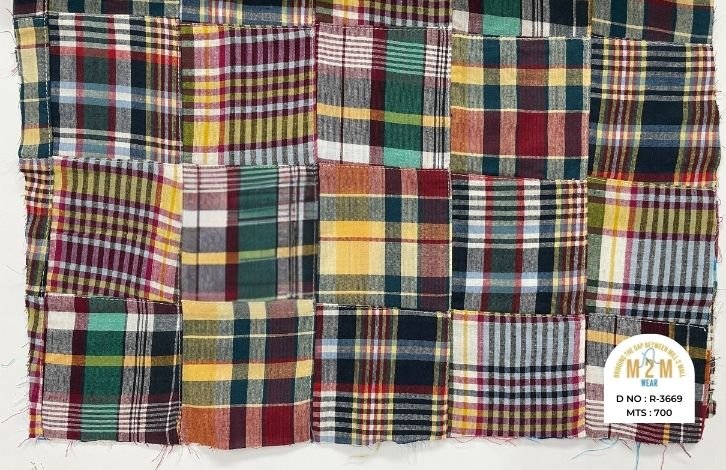 Plain weave base; constructed by stitching pre-printed cotton fabric patches in grid or panel layouts. May feature either visible topstitching or seamless joining depending on style.