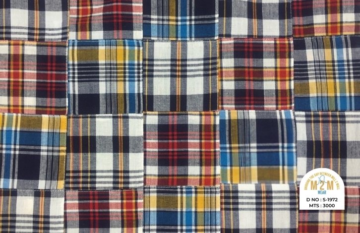 Plain weave base; constructed by stitching pre-printed cotton fabric patches in grid or panel layouts. May feature either visible topstitching or seamless joining depending on style.