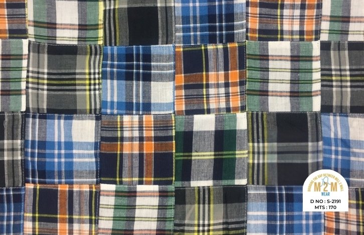 Plain weave base; constructed by stitching pre-printed cotton fabric patches in grid or panel layouts. May feature either visible topstitching or seamless joining depending on style.