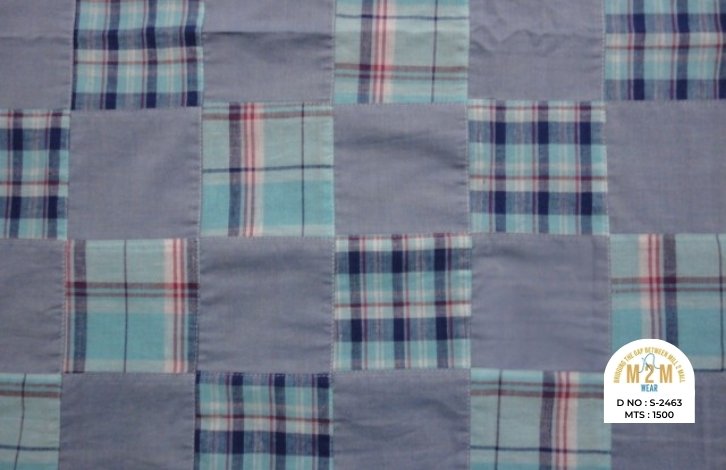 Plain weave base; constructed by stitching pre-printed cotton fabric patches in grid or panel layouts. May feature either visible topstitching or seamless joining depending on style.