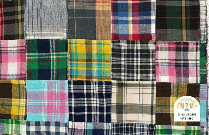Plain weave base; constructed by stitching pre-printed cotton fabric patches in grid or panel layouts. May feature either visible topstitching or seamless joining depending on style.