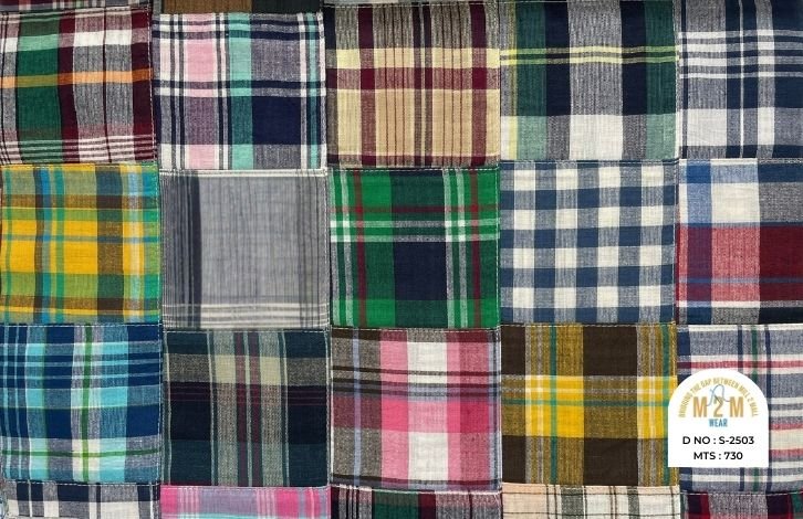Plain weave base; constructed by stitching pre-printed cotton fabric patches in grid or panel layouts. May feature either visible topstitching or seamless joining depending on style.