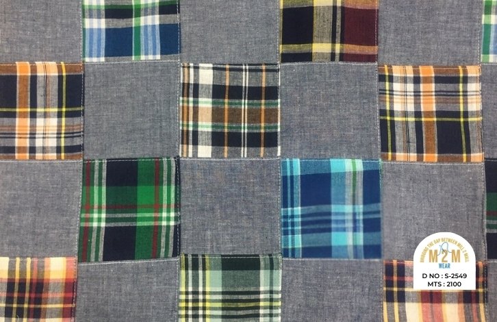 Plain weave base; constructed by stitching pre-printed cotton fabric patches in grid or panel layouts. May feature either visible topstitching or seamless joining depending on style.
