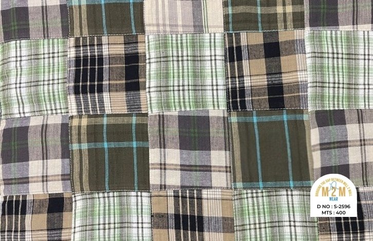 Plain weave base; constructed by stitching pre-printed cotton fabric patches in grid or panel layouts. May feature either visible topstitching or seamless joining depending on style.