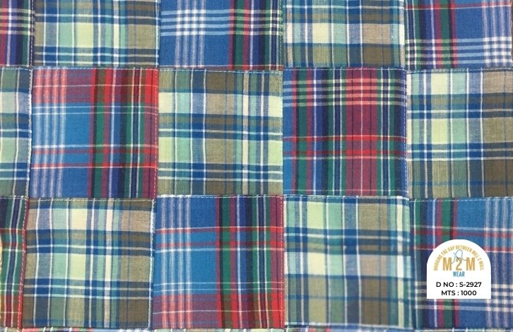 Plain weave base; constructed by stitching pre-printed cotton fabric patches in grid or panel layouts. May feature either visible topstitching or seamless joining depending on style.
