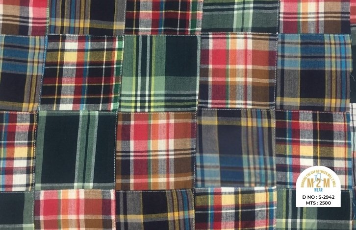 Plain weave base; constructed by stitching pre-printed cotton fabric patches in grid or panel layouts. May feature either visible topstitching or seamless joining depending on style.