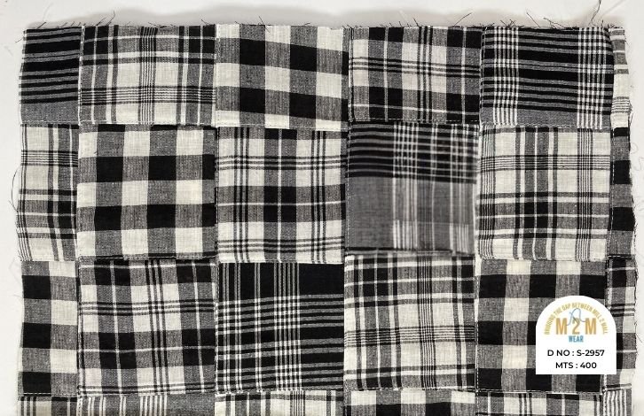 Plain weave base; constructed by stitching pre-printed cotton fabric patches in grid or panel layouts. May feature either visible topstitching or seamless joining depending on style.