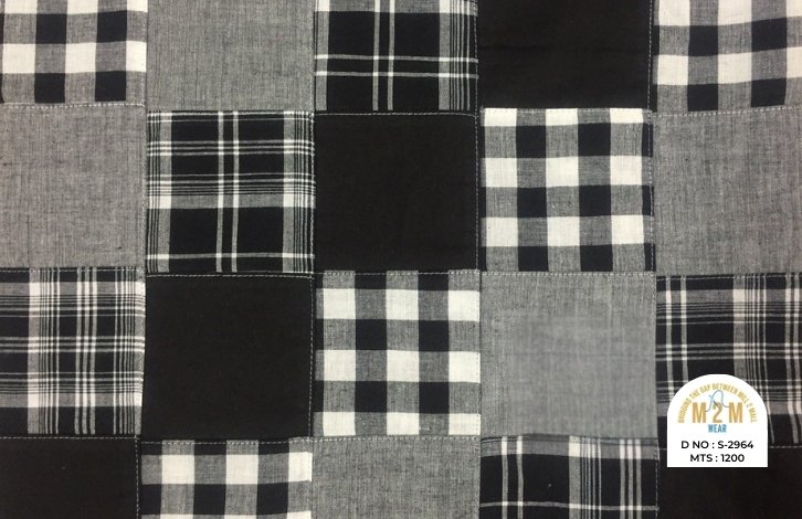 Plain weave base; constructed by stitching pre-printed cotton fabric patches in grid or panel layouts. May feature either visible topstitching or seamless joining depending on style.
