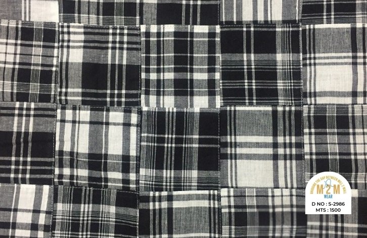 Plain weave base; constructed by stitching pre-printed cotton fabric patches in grid or panel layouts. May feature either visible topstitching or seamless joining depending on style.