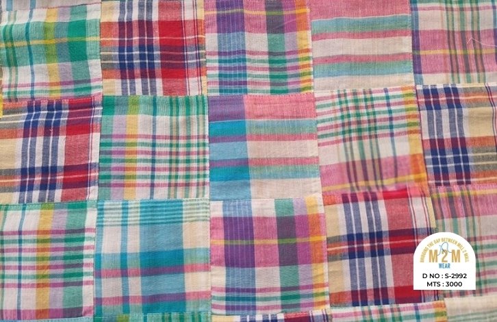 Plain weave base; constructed by stitching pre-printed cotton fabric patches in grid or panel layouts. May feature either visible topstitching or seamless joining depending on style.
