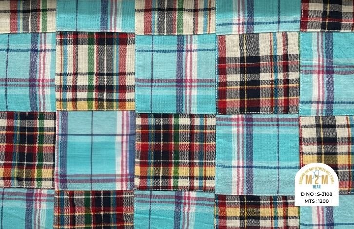 Plain weave base; constructed by stitching pre-printed cotton fabric patches in grid or panel layouts. May feature either visible topstitching or seamless joining depending on style.
