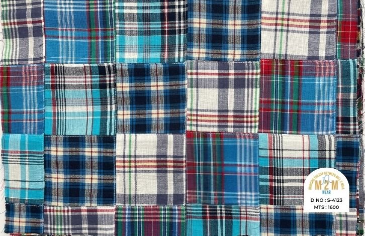 Plain weave base; constructed by stitching pre-printed cotton fabric patches in grid or panel layouts. May feature either visible topstitching or seamless joining depending on style.
