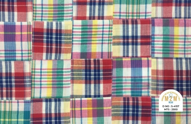 Plain weave base; constructed by stitching pre-printed cotton fabric patches in grid or panel layouts. May feature either visible topstitching or seamless joining depending on style.