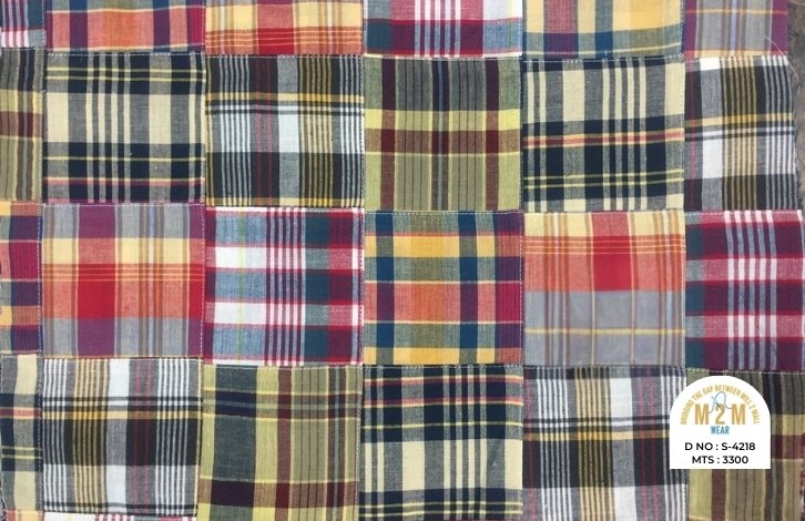 Plain weave base; constructed by stitching pre-printed cotton fabric patches in grid or panel layouts. May feature either visible topstitching or seamless joining depending on style.