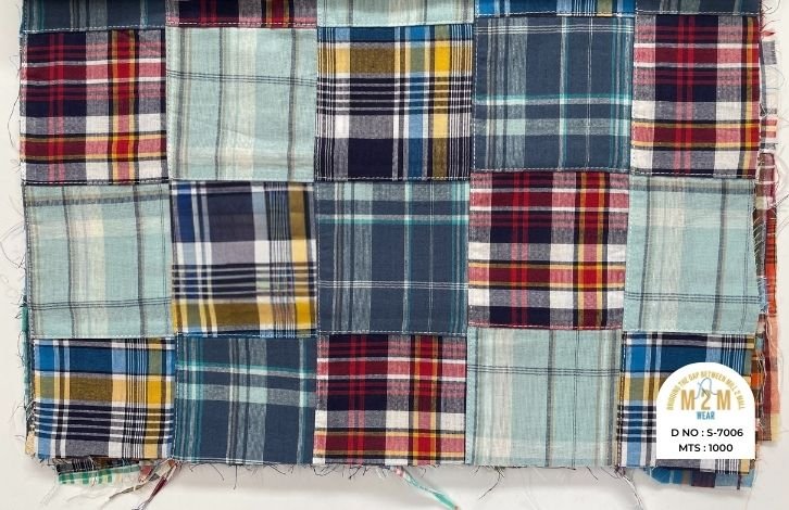 Plain weave base; constructed by stitching pre-printed cotton fabric patches in grid or panel layouts. May feature either visible topstitching or seamless joining depending on style.
