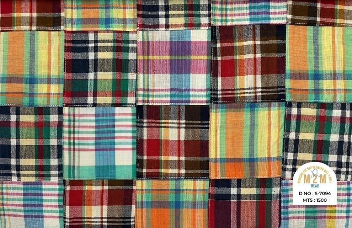 Plain weave base; constructed by stitching pre-printed cotton fabric patches in grid or panel layouts. May feature either visible topstitching or seamless joining depending on style.