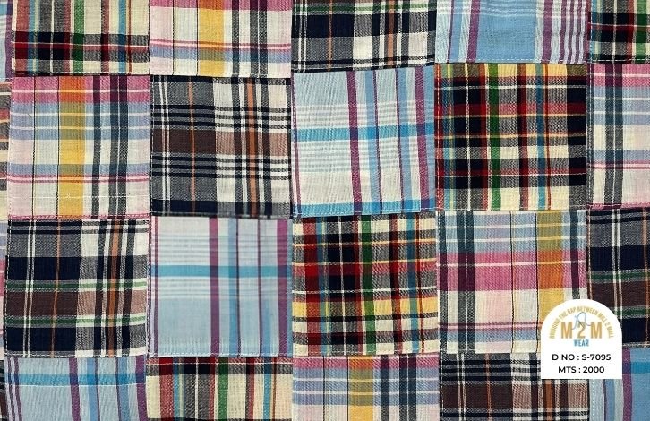 Plain weave base; constructed by stitching pre-printed cotton fabric patches in grid or panel layouts. May feature either visible topstitching or seamless joining depending on style.