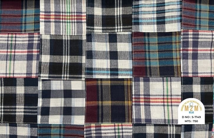 Plain weave base; constructed by stitching pre-printed cotton fabric patches in grid or panel layouts. May feature either visible topstitching or seamless joining depending on style.