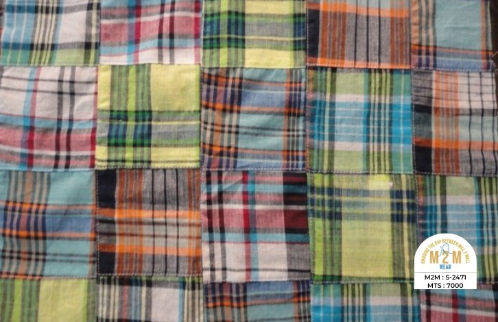 Plain weave base; constructed by stitching pre-printed cotton fabric patches in grid or panel layouts. May feature either visible topstitching or seamless joining depending on style.